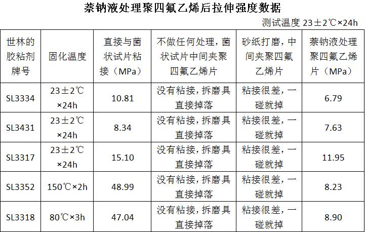 1.經(jīng)萘鈉液處理之后的5種膠粘接強度明顯要高于不做處理的,至于這五種種環(huán)氧膠的粘接對比此數(shù)據(jù)可能存在一定的偏差,目前就測試后的數(shù)據(jù)來看是SL3317最好。因為有些模具的邊緣沒有與PTFE粘到一起。